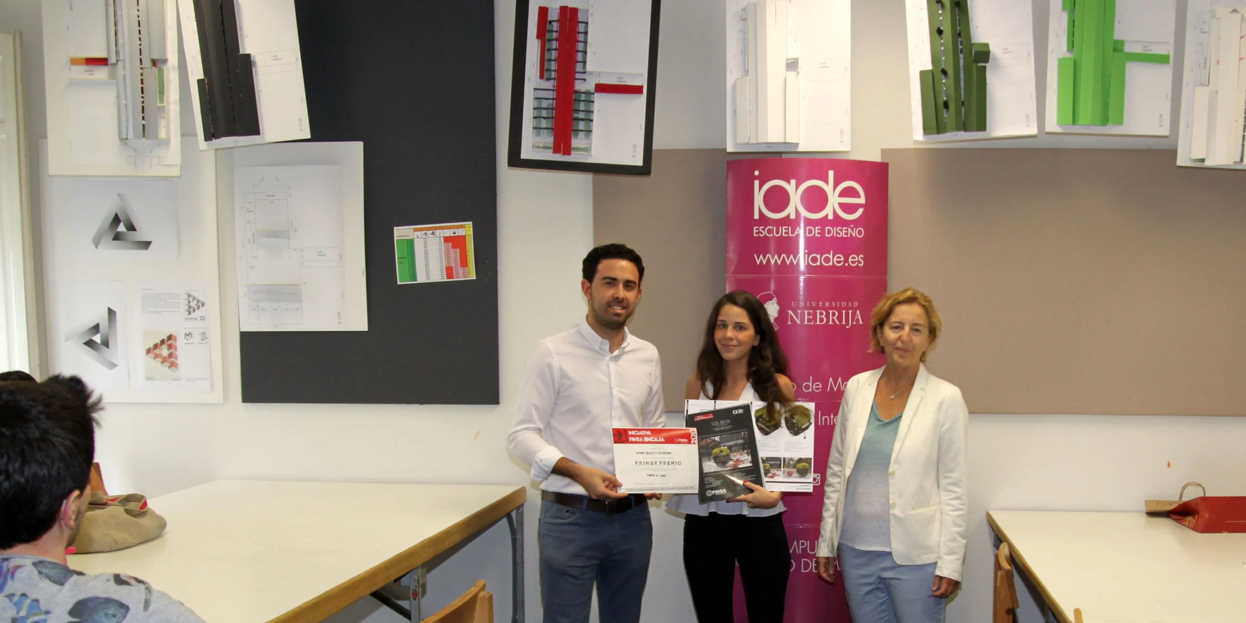 La entrega de premios se celebró en las instalaciones de IADE y las estudiantes de la Escuela de Diseño de Interiores recibieron sus diplomas y premio de Mercedes Pérez de Castro, profesora de Proyectos de 3º de Diseño de Interiores, y Luis Suárez Contero, representante de Finsa.